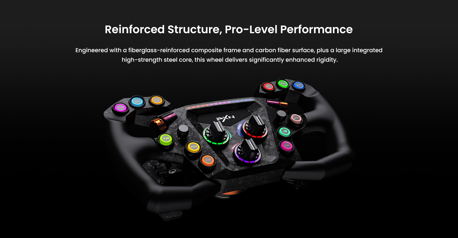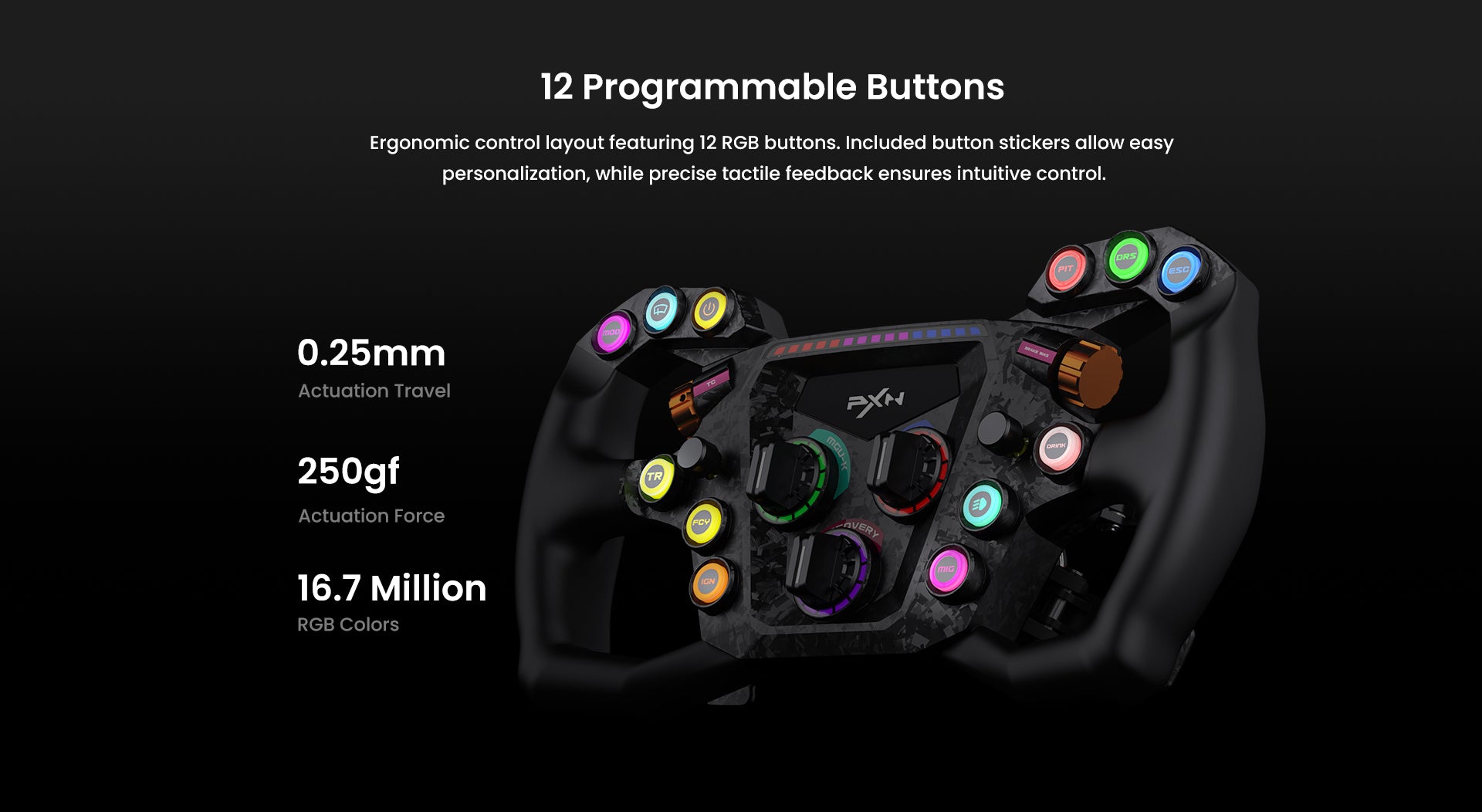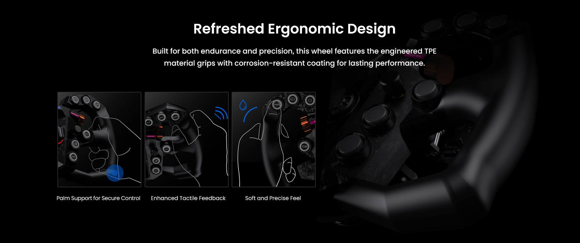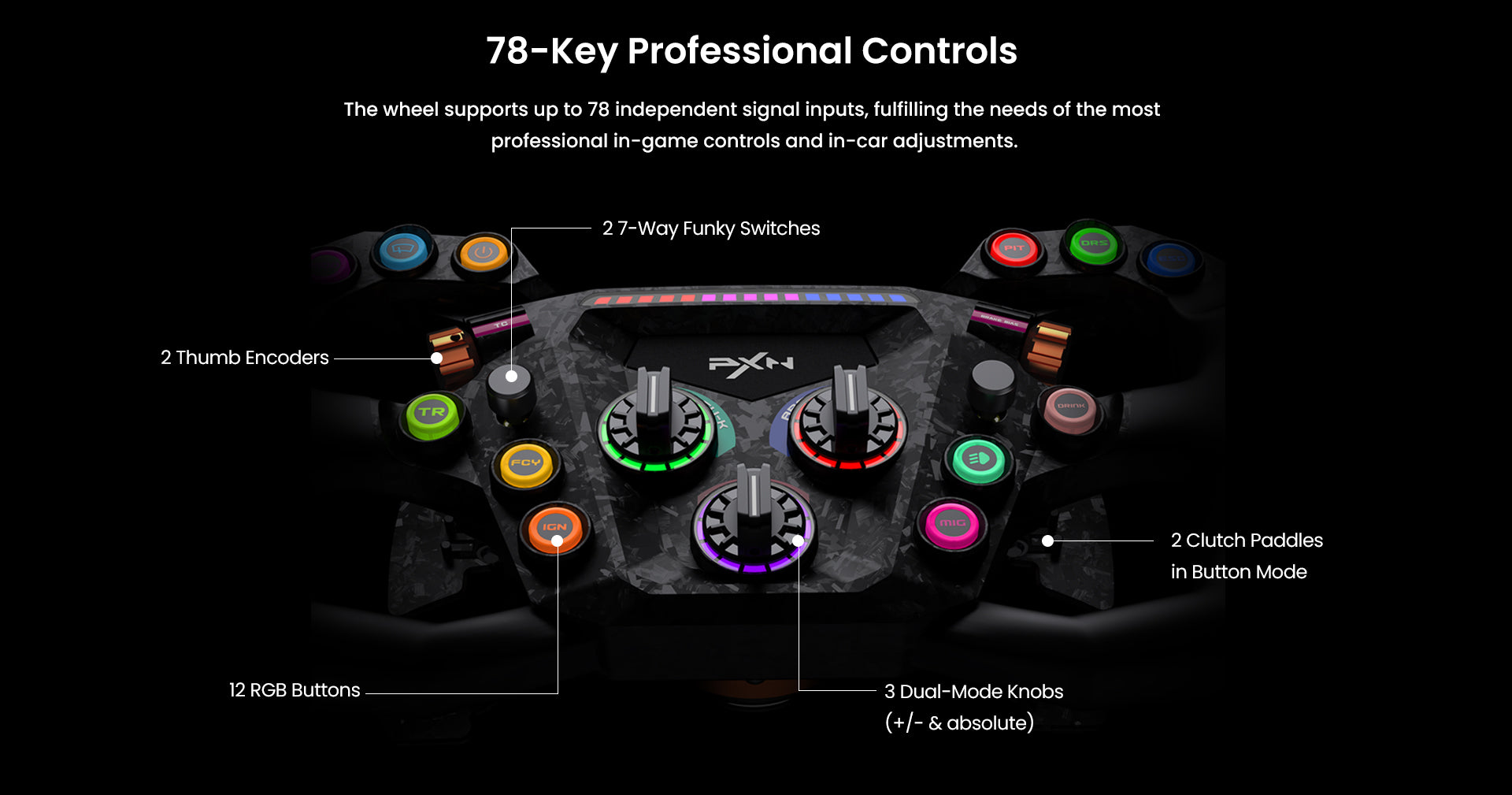 The GT ONE is equipped with 12 RGB Buttons, 2 7-Way Funky Switches, 2 Thumb Encoders, 3 Absolute Encoders and dual-clutch paddles, with a total of 78 input signals available, which fully meets the control needs of various sim racing games.