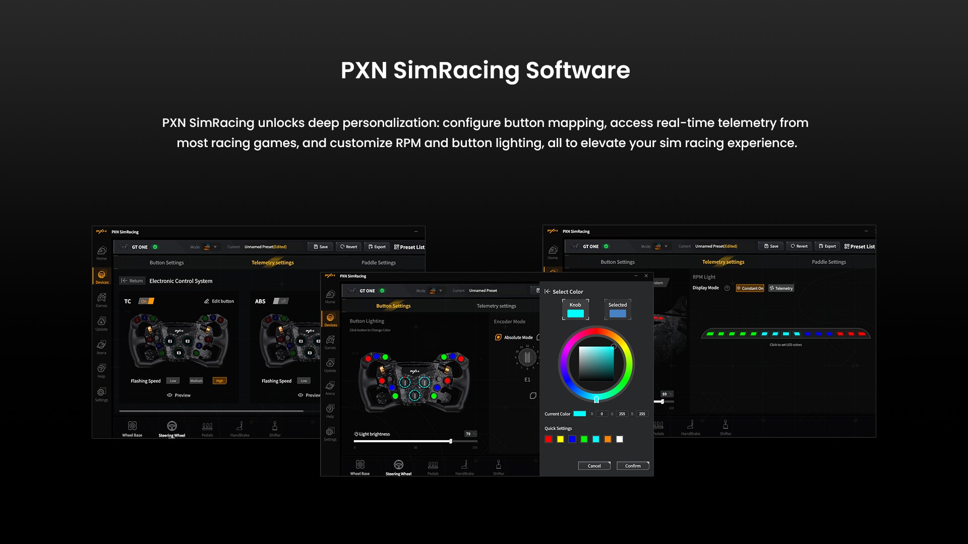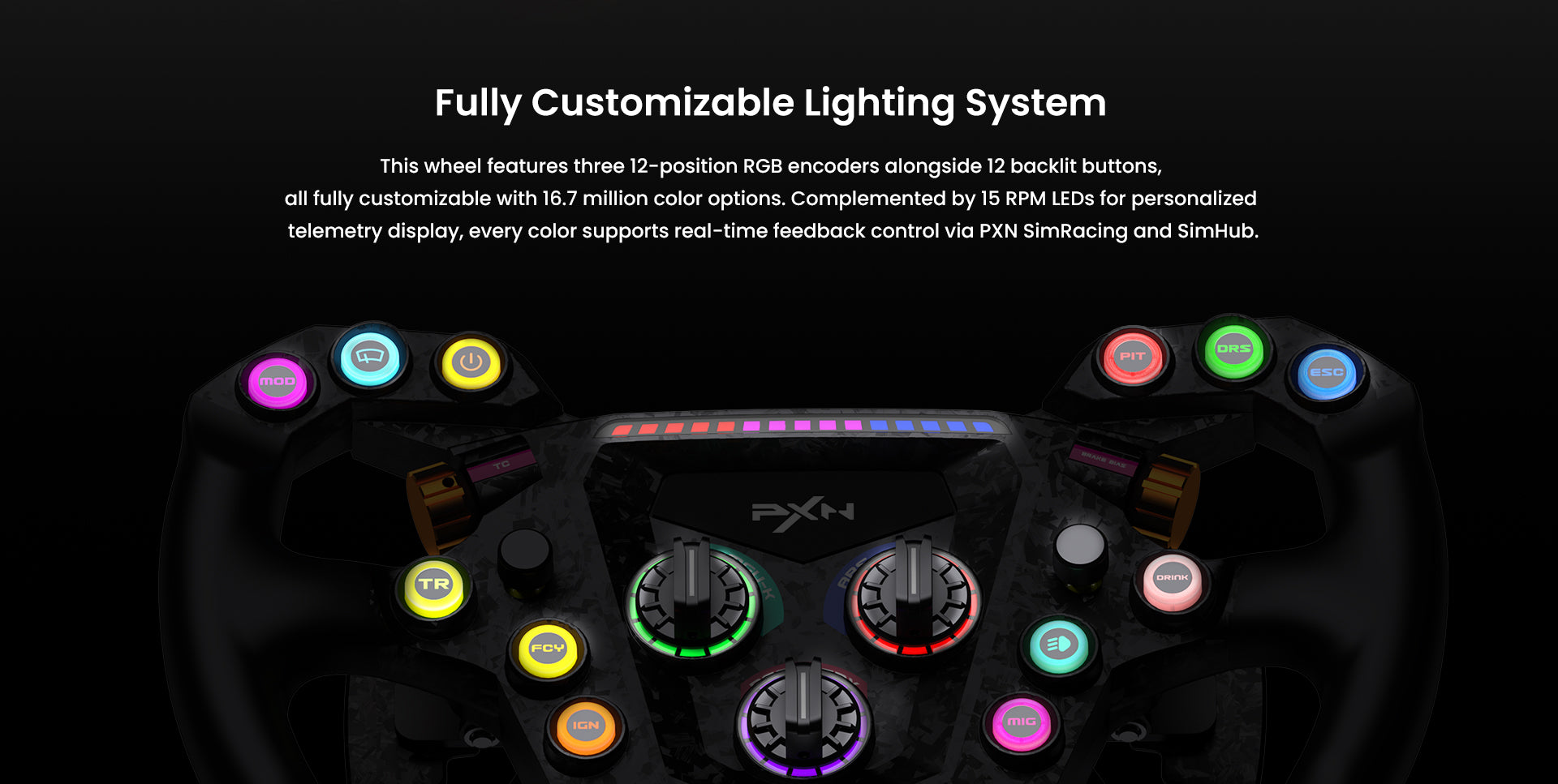 The GT ONE natively fully supports SimHub software, through which advanced functions such as full custom RGB lighting, sim racing telemetry data synchronization, real-time linkage between RPM lighting effects, and intelligent telemetry data visualization can be realized.